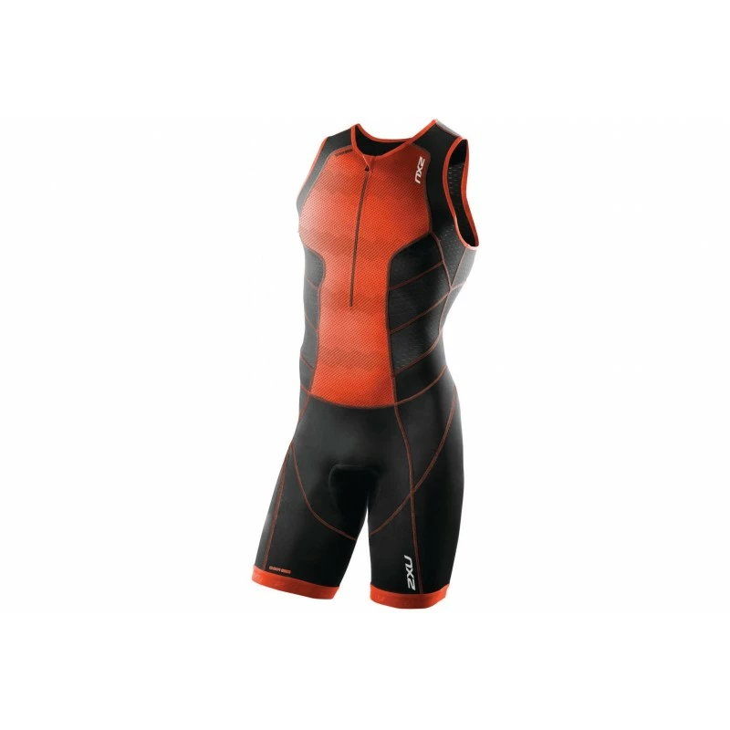 Les meilleures performances se réalisent avec le meilleur équipement ! Pour vos séances de triathlon, choisissez la combinaison 2XU Perform Tri Suit noire et orange pour homme (Collection Printemps/Eté).