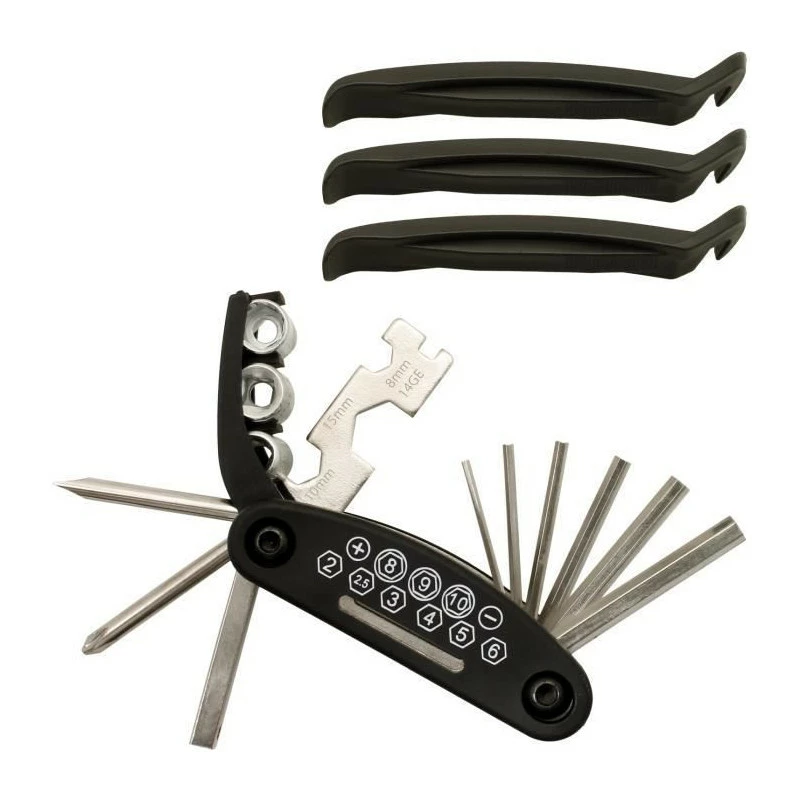 16 Fonction – Clé à douille (8,9, 10mm), Clé Solide (8,9, 10mm), Clé à rayons (14GE), Tournevis Plat et Philips, Tige d’extension et Clé hexagonale (2, 2,5, 3, 4, 5, 6mm) éger, multifonctionnel, compact et facile à transporter – très petit à mettre dans votre sac ou votre poche Aidez à réparer la plupart des problèmes de vélo en tant que kit d’outils de voyage, et peut être utilisé comme outil